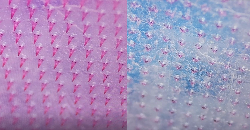 接下來,我們再通過圖3觀察一下微針疫苗貼的貼敷過程和貼前貼后微針貼的完整顯微照片。