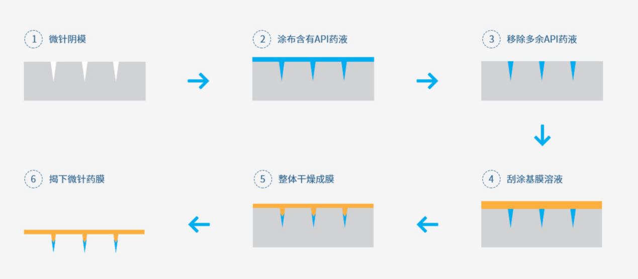 我們知道可溶解微針又包含兩種生產工藝,分別是一體針工藝(圖6)和分層針工藝(圖7),前者適用于化藥,后者適用于生物藥。